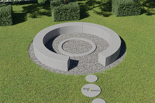 Elegantiška apvali betoninė lauko erdvė su suoliuku ir centrine ugniakuro/dekoratyvine vieta